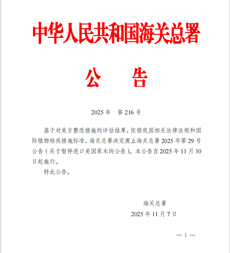 11月7日,中国海关总署发布第216号公告,宣布废止今年3月实施的《关于暂停进口美国原木的公告》,从11月10日起正式恢复美国原木进口。至此,暂停近八个月的中美原木贸易重新开启,为国内木材加工和家居制造行业带来新的供给变量。