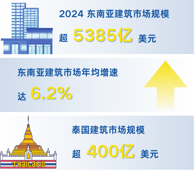 在“一带一路”深化与中国东盟自贸区3.0版政策的推动下,东南亚建筑市场正迎来前所未有的发展机遇,2024年建筑市场规模超5385亿美元,年均增速达6.2%,潜力巨大。泰国作为东盟第二大建筑市场,政府推出以“东部经济走廊”(EEC)为核心的区域经济发展政策,每年建筑市场规模超过400亿美元。