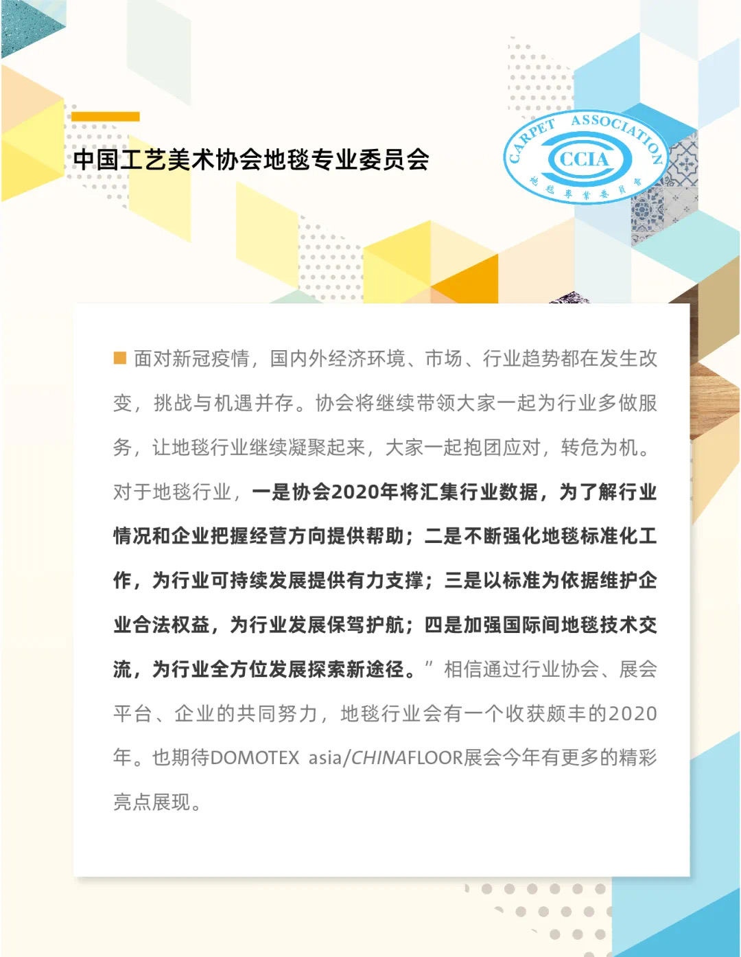 展会是疫情后经济发展中贸易、投资、技术交流的重要平台。DOMOTEX asia作为全球地材行业发展的风向标,我们选择金秋9月这一贸易黄金期重启展会,也是期冀在疫情结束后的稳定期,随着市场信心和全球经济的全面恢复,促进行业经济恢复,重振企业信心,推动行业复苏。多家行业协会