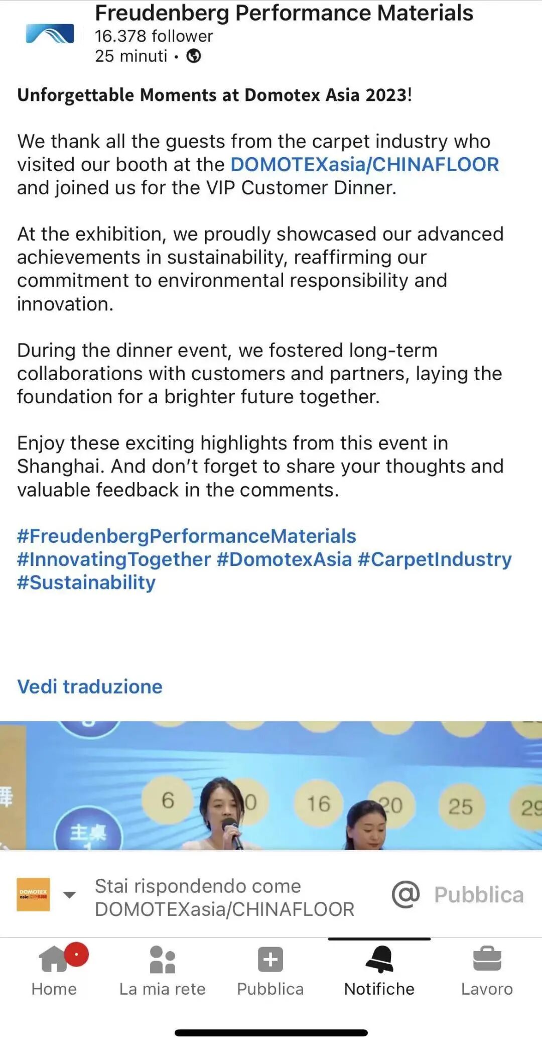 很高兴能参加DOMOTEX asia 2023,这次展会是后疫情时代整个行业集体复苏、交流的平台。我们看到所有行业内知名的企业全部来参加,我们整个产业链的精英人才全部汇集在此,还有我们国内外专业的买家团队全都莅临这个展会,对我们整个行业的交流,对我们整个地毯行业技术进步,以及我们企业的共同发展,有着深刻的指导意义。