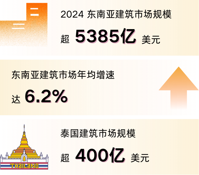 在“一带一路”深化与中国东盟自贸区3.0版政策的推动下,东南亚建筑市场正迎来前所未有的发展机遇,2024年建筑市场规模超5385亿美元,年均增速达6.2%,潜力巨大。泰国作为东盟第二大建筑市场,政府推出以“东部经济走廊”(EEC)为核心的区域经济发展政策,每年建筑市场规模超过400亿美元。