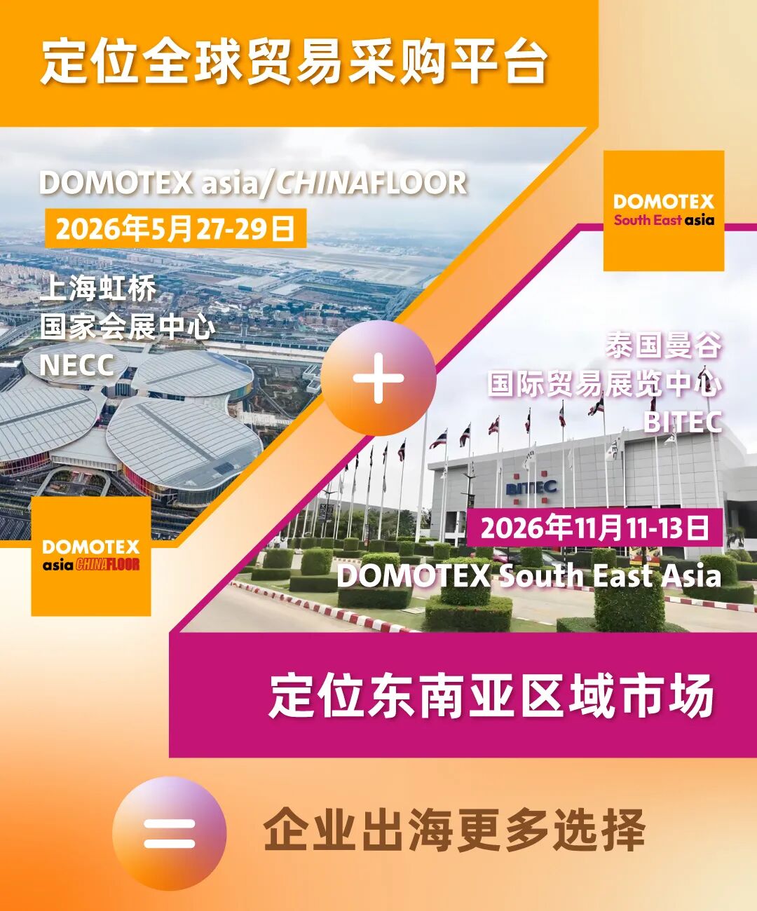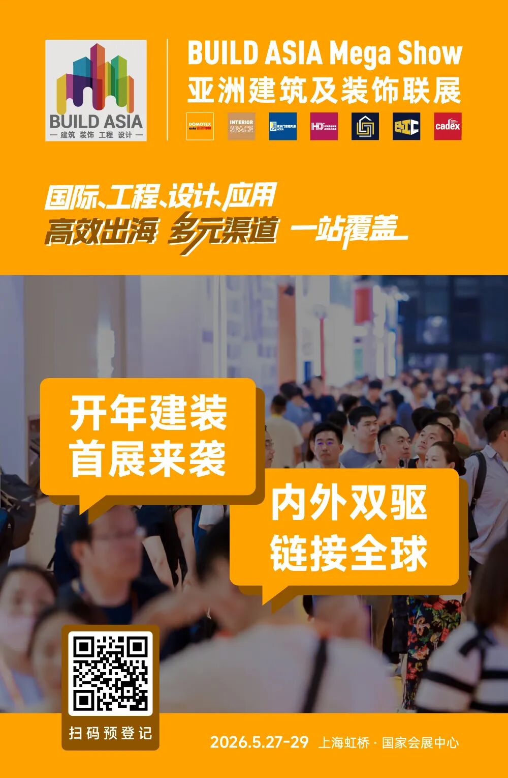 2026年5月27-29日,上海虹桥·国家会展中心,DOMOTEX asia与BUILD ASIA Mega Show即将迎接全球建装行业同仁的到来。无论您是寻求全球布局的制造企业,还是希望对接优质资源的专业买家,这里都将是您值得关注的行业盛会。让我们相聚上海,共同见证产业的新发展!