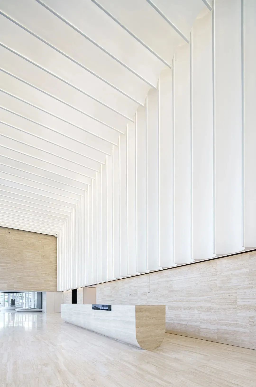 AIM使用高科技机电集成一体化天花勾勒了大堂的上部。铝板制成的弧形吊顶将强光折射回大堂,给予空间均匀柔和的光照。铝合金弧形天花创造出一种韵律,表现出与洞石的平滑与低调不同的特性。弧形天花一直延伸至建筑外顶棚,模糊了室内外的边界。