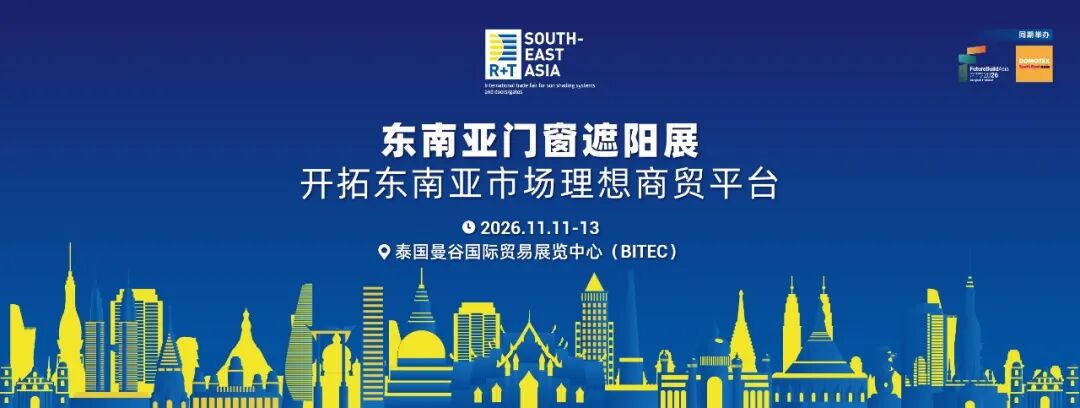 2026年11月11日至13日,全球门窗遮阳行业盛会R+T将首次登陆泰国曼谷,在泰国曼谷国际贸易展览中心(BITEC)举办R+T South East Asia东南亚门窗遮阳展。